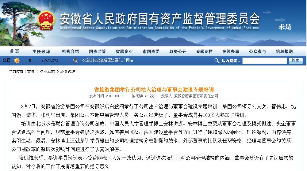 2010年8月2日,公司董事長安林博士為安徽省旅游集團機關(guān)及下屬幾十家企業(yè)領(lǐng)導講授《當前國企董事會治理與建設(shè)》,這是繼5月24日為安徽省國資委所屬企業(yè)領(lǐng)導講授《國企董事會治建設(shè):成效、難題與對策》之后的再受邀。