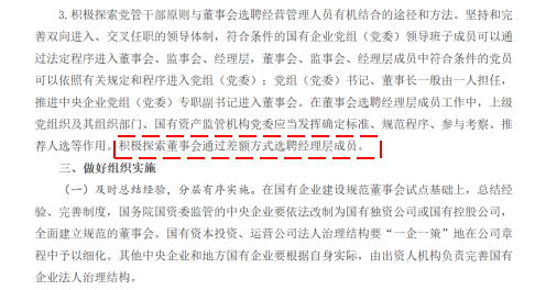 2017年5月3日《國務院辦公廳關于進一步完善國有企業(yè)法人治理結構的指導意見》(國辦發(fā)〔2017〕36號)正式頒布。文件正式提出:“積極探索董事會通過差額方式選聘經(jīng)理層成員。”