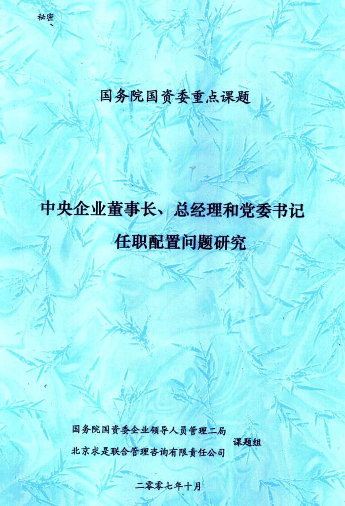 2006年,求是咨詢受國務(wù)院國資委企業(yè)領(lǐng)導(dǎo)人員管理二局邀請主持重點課題《中央企業(yè)董事長、總經(jīng)理和黨委書記任職配置問題研究》。