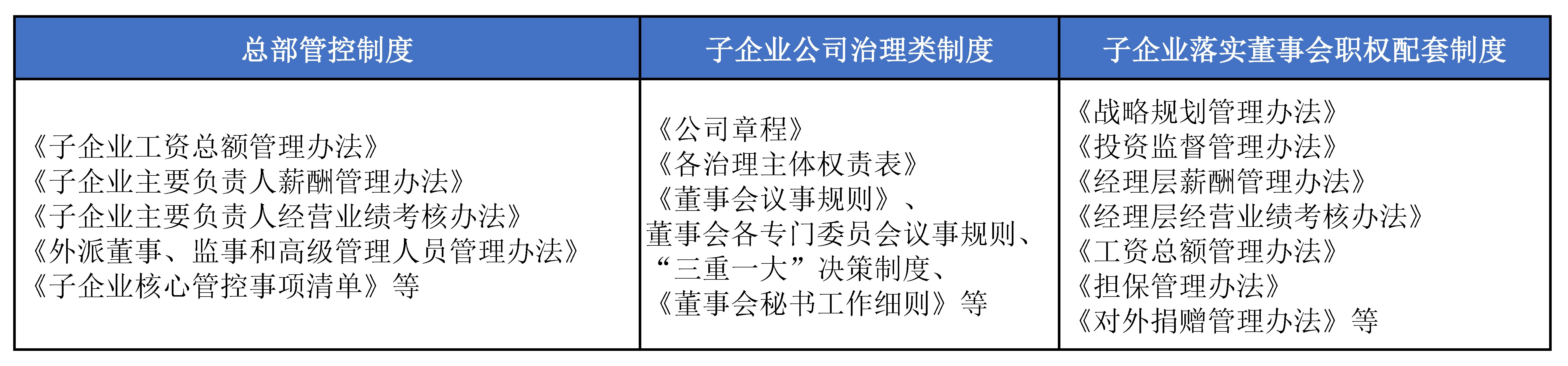 從集團層面來看,應(yīng)重點針對全資、控股子企業(yè)完善管控制度,以及外派董事、監(jiān)事等人員的管理與考核評價制度。從子企業(yè)層面,既要完善公司治理類制度體系建設(shè),又要加強落實董事會職權(quán)配套制度體系建設(shè)。