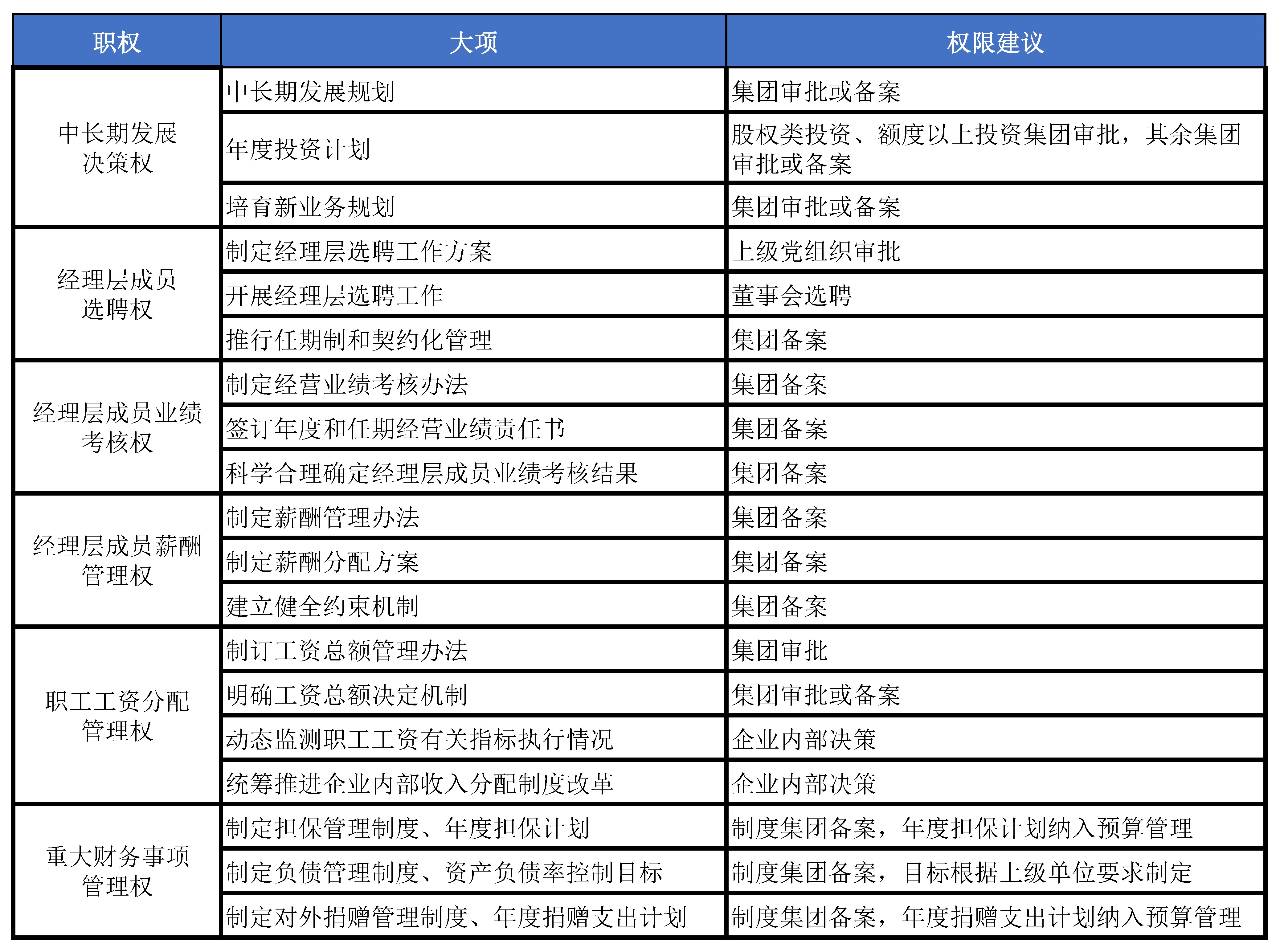 從《中央企業(yè)落實子企業(yè)董事會職權(quán)操作指引》政策精神來看,應(yīng)重點落實中長期發(fā)展決策權(quán)、經(jīng)理層成員選聘權(quán)、經(jīng)理層成員業(yè)績考核權(quán)、經(jīng)理層成員薪酬管理權(quán)、職工工資分配管理權(quán)、重大財務(wù)事項管理權(quán)六項職權(quán)。求是咨詢結(jié)合對政策的理解以及操作實踐,建議集團公司應(yīng)針對不同子企業(yè),在不同的職權(quán)落實方式與深度上有所區(qū)別。