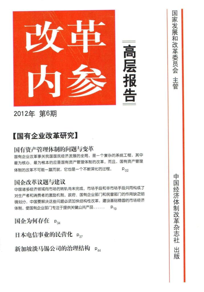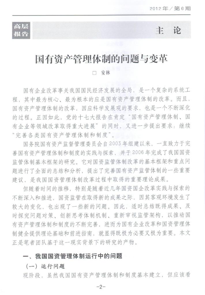 后者即“國(guó)有資本投資運(yùn)營(yíng)公司”“由政府直接授權(quán)國(guó)有資本投資運(yùn)營(yíng)公司履行出資人職責(zé)”等理念構(gòu)想,在2011年求是咨詢董事長(zhǎng)、《改革內(nèi)參》高層報(bào)告特約研究員安林博士受邀主持中國(guó)經(jīng)濟(jì)體制改革研究會(huì)“國(guó)家戰(zhàn)略與改革課題組”之“國(guó)有企業(yè)改革”重大課題時(shí),被再次提出,研究成果收錄于《國(guó)有資產(chǎn)管理體制的問(wèn)題與變革》一文,此以第一論文(全文1.1萬(wàn)字),發(fā)表于中央內(nèi)刊《改革內(nèi)參》(高層報(bào)告)2012年第6期。(注:更全內(nèi)容詳見(jiàn)求是咨詢董事長(zhǎng)安林博士著、2011年法律出版社出版的《建設(shè)中國(guó)特色董事會(huì)》一書(shū)P235-277文:“研究:我國(guó)國(guó)有管理體制運(yùn)行成效、問(wèn)題與完善、變革之道”)