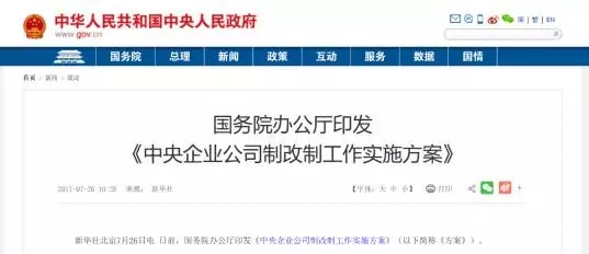 《方案》給出了明確時(shí)間表:2017年年底前,除中央金融、文化企業(yè)外,按照全民所有制工業(yè)企業(yè)法登記、國資委監(jiān)管的中央企業(yè)全部改制為按照公司法登記的有限責(zé)任公司或股份有限公司。