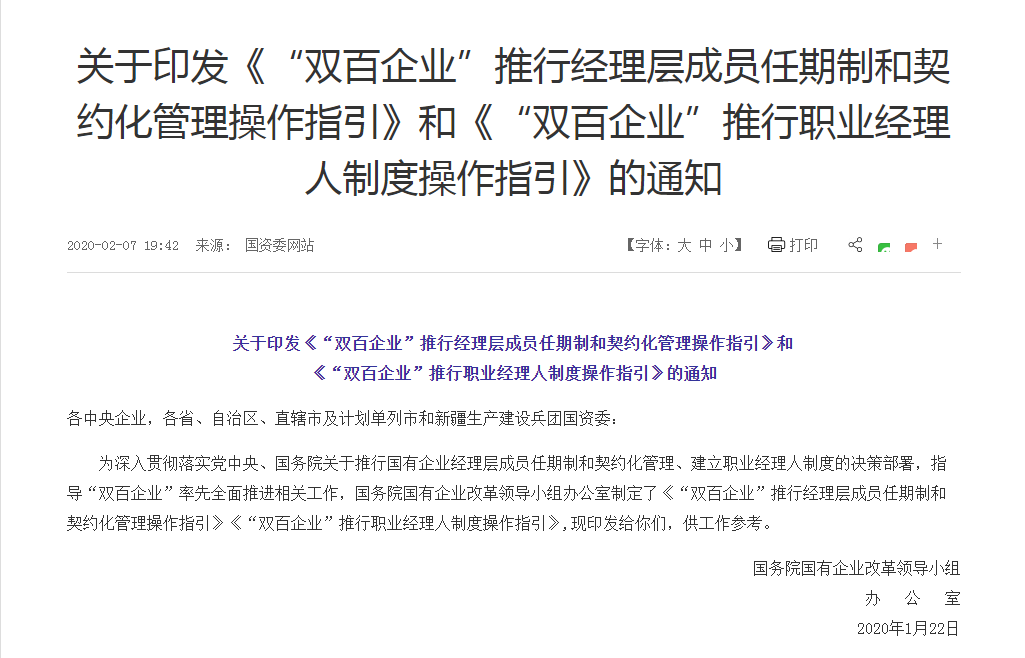 為建立健全市場(chǎng)化經(jīng)營(yíng)機(jī)制,更好解決三項(xiàng)制度改革中的突出矛盾和問(wèn)題,有效激發(fā)微觀主體活力,2020年1月,國(guó)務(wù)院國(guó)有企業(yè)改革領(lǐng)導(dǎo)小組辦公室在梳理相關(guān)政策和企業(yè)實(shí)踐經(jīng)驗(yàn)的基礎(chǔ)上,制定了《“雙百企業(yè)”推行經(jīng)理層成員任期制和契約化管理操作指引》《“雙百企業(yè)”推行職業(yè)經(jīng)理人制度操作指引》(以下簡(jiǎn)稱“《操作指引》”)。