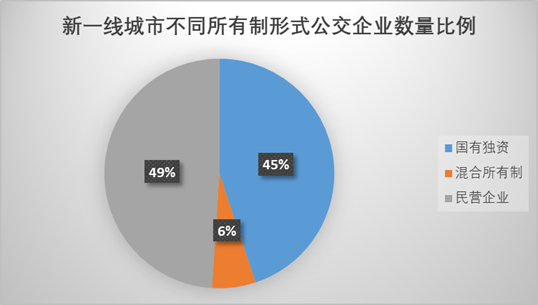 新一線城市選取了成都市、重慶市、杭州市、天津市、鄭州市等5個(gè)城市。調(diào)研數(shù)據(jù)顯示:國(guó)有獨(dú)資公交企業(yè)22家,占比45%,民營(yíng)公交企業(yè)24家,占比49.0%,混合所有制公交企業(yè)3家,占比6%。新一線城市都有一個(gè)大型的國(guó)有獨(dú)資公交企業(yè),公交資源大部分是國(guó)家所有,僅成都市和鄭州市民營(yíng)企業(yè)相對(duì)數(shù)量較多,主要負(fù)責(zé)部分縣區(qū)的公交線路運(yùn)營(yíng)。