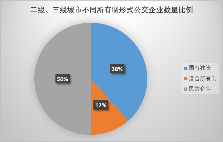 二線城市選取了廈門市、哈爾濱市、烏魯木齊市等3個(gè)城市,三線城市選取了臨沂市、麗江市、三亞市、呼和浩特市、銀川市等5個(gè)城市。調(diào)研數(shù)據(jù)顯示:國(guó)有獨(dú)資公交企業(yè)20家,占比38%,民營(yíng)公交企業(yè)26家,占比50%,混合所有制公交企業(yè)6家,占比12%。二線城市哈爾濱除哈爾濱公共交通有限公司為國(guó)有獨(dú)資外,其他均為民營(yíng)企業(yè)和混合所有制企業(yè),且民營(yíng)企業(yè)占比較高。三線城市普遍為國(guó)有獨(dú)資公司,以城市公交集團(tuán)為中心,向各縣區(qū)分設(shè)獨(dú)立子公司或分公司的方式運(yùn)營(yíng)。