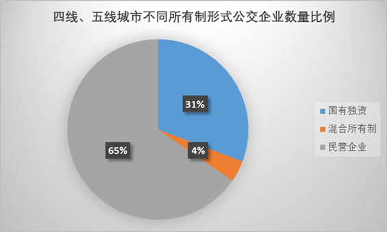 四線城市選取了湘潭市、桂林市、商丘市等3個(gè)城市,五線城市選取了伊犁哈薩克自治州、銅陵市、涼山彝族自治州、衡水市四個(gè)城市。調(diào)研數(shù)據(jù)顯示:國(guó)有獨(dú)資公交企業(yè)16家,占比31%,民營(yíng)公交企業(yè)34家,占比65%,混合所有制公交企業(yè)2家,占比4%。隨著城市經(jīng)濟(jì)發(fā)展水平的降低,民營(yíng)公交企業(yè)的數(shù)量總體有一定程度的上升,但是公交企業(yè)的所有制形式與地區(qū)的管理方式有較密切的關(guān)系,例如桂林市、商丘市、衡水市除城區(qū)由國(guó)有企業(yè)提供公交運(yùn)營(yíng),縣區(qū)公交基本由民營(yíng)企業(yè)根據(jù)區(qū)域劃分進(jìn)行運(yùn)營(yíng)。