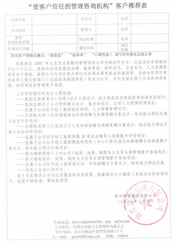 鑒于求是聯(lián)合公司的優(yōu)質(zhì)服務和咨詢質(zhì)量,我集團還為之推薦了其他央企的咨詢項目,包括中國鐵通,攀鋼集團等。
