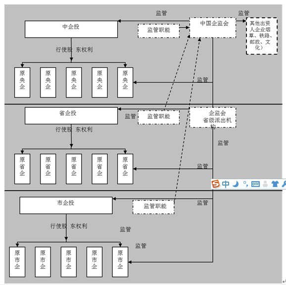 未來模式下,國資委或消亡或發(fā)展成為全國性的企業(yè)國資監(jiān)管人——中國企監(jiān)會(huì),行使“權(quán)力”,對(duì)全國各類企業(yè)國有資本——無論是“中企投”系統(tǒng)的企業(yè)國有資本,還是“省企投”體系的企業(yè)國有資本,也無論是原國資委系統(tǒng)的企業(yè)國有資本,還是其他出資人(如煙草、文化、郵政、鐵路等系統(tǒng))企業(yè)國有資本——進(jìn)行監(jiān)管。同時(shí),政府之于企業(yè)的市場行為,也為中國企監(jiān)會(huì)所監(jiān)督。