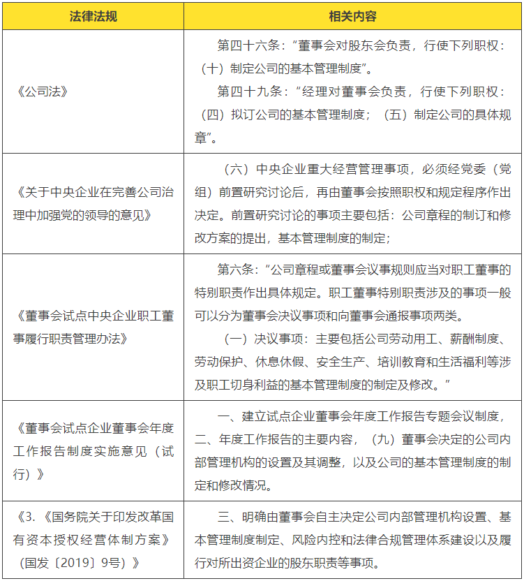 (一)《公司法》規(guī)定董事會(huì)的職權(quán)是“制定基本管理制度”,總經(jīng)理的是“制定具體規(guī)章制度”?!豆痉ā焚x予董事會(huì)的身份是“最高決策機(jī)構(gòu)”,賦予總經(jīng)理的是“最高執(zhí)行機(jī)構(gòu)”?!豆痉ā穼⒐竟芾碇贫葏^(qū)分為基本管理制度和具體規(guī)章兩種類型。依此理解“基本管理制度”應(yīng)當(dāng)是對(duì)公司經(jīng)營管理各個(gè)方面一些意義重要、原則性強(qiáng)、覆蓋面廣的制度,而“具體規(guī)章制度”則應(yīng)當(dāng)是針對(duì)經(jīng)營管理工作中某一具體環(huán)節(jié)、業(yè)務(wù)、崗位的制度,具有詳細(xì)、具體、微觀、局部的特點(diǎn)。