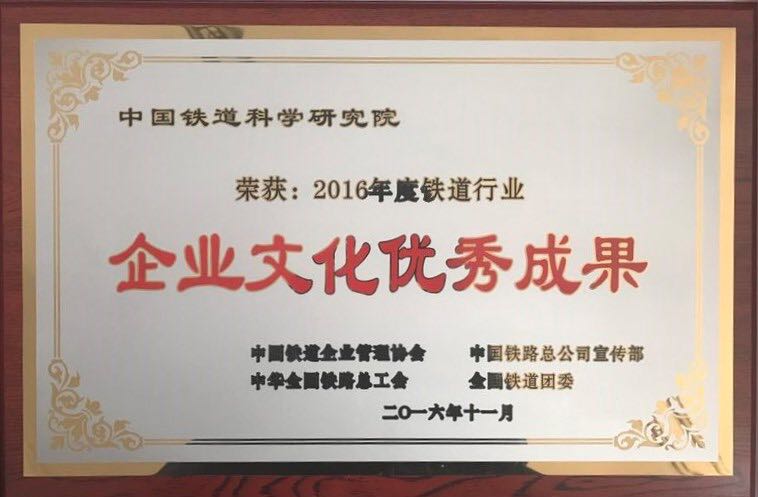 2017年3月,中國(guó)鐵道科學(xué)研究院榮獲“2016年度鐵道行業(yè)企業(yè)文化優(yōu)秀成果”獎(jiǎng)。中國(guó)鐵道科學(xué)研究院是中國(guó)鐵路總公司直屬企業(yè)。近年來(lái),鐵科院企業(yè)文化理念開(kāi)始深入人心,企業(yè)文化建設(shè)工作備受重視。作為鐵路行業(yè)唯一的多學(xué)科、多專(zhuān)業(yè)綜合性科研機(jī)構(gòu),鐵科院的企業(yè)文化建設(shè),立足于科技支撐、服務(wù)鐵路發(fā)展的理念,凸顯科技特色,重在體系建設(shè)。