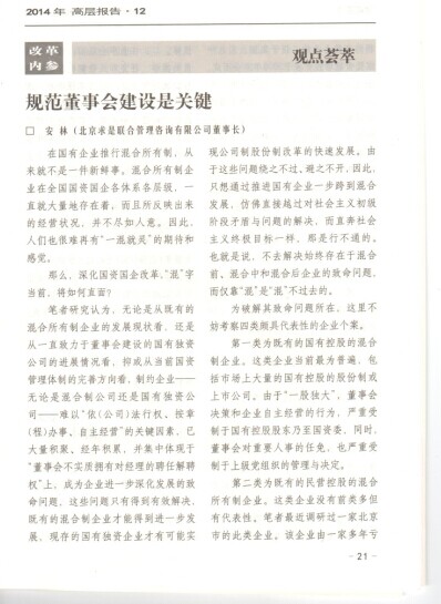2014年6月17日出版的《改革內(nèi)參》(高層報告)“觀點薈萃”,刊載了《改革內(nèi)參》(高層報告)特約研究員、我求是咨詢董事長安林博士的署名文章:《規(guī)范董事會建設是關鍵》。