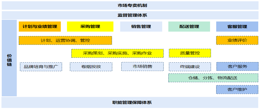 那么,煙草商業(yè)企業(yè)應(yīng)如何進(jìn)一步促進(jìn)高質(zhì)量發(fā)展?筆者通過(guò)咨詢實(shí)踐和研究認(rèn)為,煙草商業(yè)企業(yè)高質(zhì)量發(fā)展從根本上來(lái)說(shuō),就是要優(yōu)化企業(yè)價(jià)值鏈(如圖1所示),關(guān)鍵做法就是:在市場(chǎng)專賣機(jī)制、監(jiān)督管理體系和職能管理保障體系框架下,有效管控從計(jì)劃與業(yè)績(jī)管理、采購(gòu)、銷售、配送到客服的價(jià)值鏈環(huán)節(jié),進(jìn)一步強(qiáng)化價(jià)值鏈各環(huán)節(jié)的內(nèi)部協(xié)同,打破企業(yè)內(nèi)部部門(mén)墻、業(yè)務(wù)板塊壁壘,全面系統(tǒng)地開(kāi)展提質(zhì)增效工作,以實(shí)現(xiàn)企業(yè)核心競(jìng)爭(zhēng)力的有力提升。