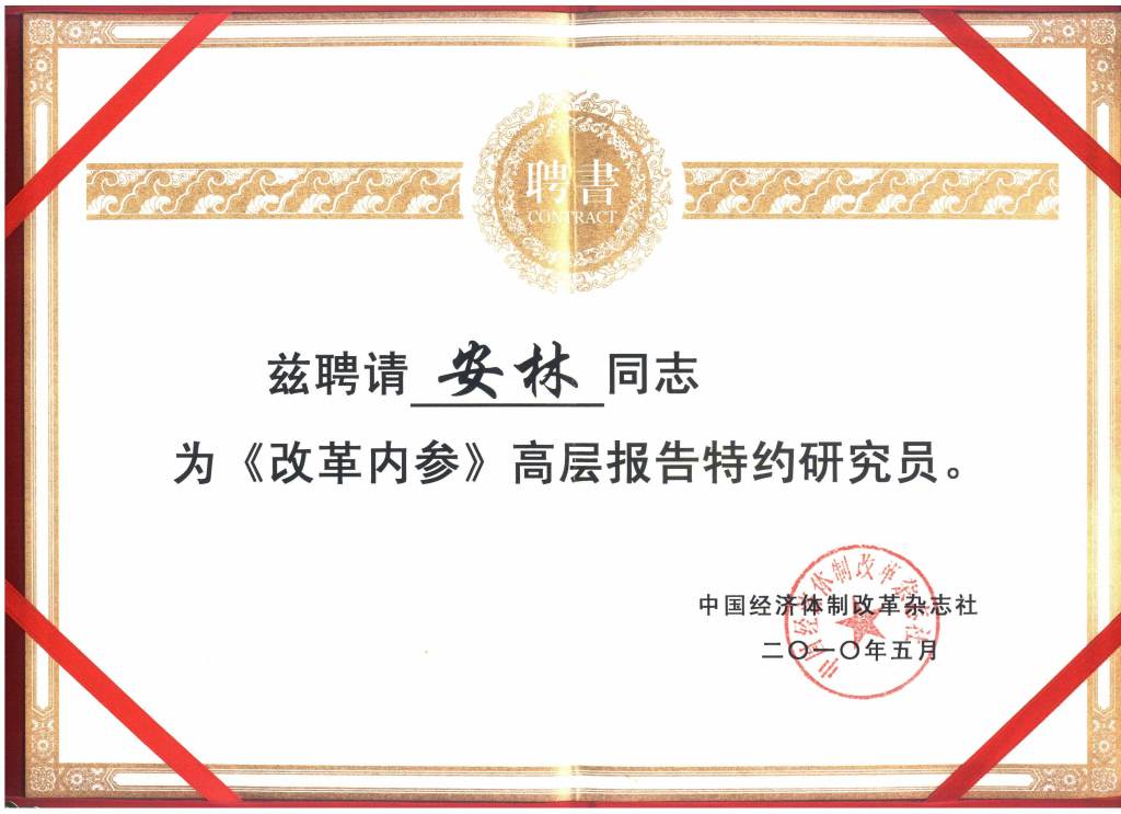 2011年9月4日,由中國經(jīng)濟體制改革雜志社、《改革內(nèi)參》高層報告編輯部主辦的“《改革內(nèi)參》高層報告特約專家/研究員首屆會議”,在北京友誼賓館嘉賓樓隆重舉行。我司董事長安林博士作為中國國資與國企改革咨詢研究專家,被聘為《改革內(nèi)參》高層報告特約研究員。