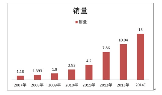 從2007年到2013年全球智能手機的銷量從1億部上升到2013年的10億部,6年時間銷量快速增長,2014年智能手機預(yù)計銷量13億部。