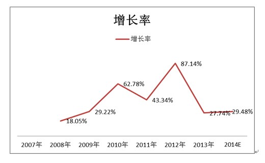 從2008年到2013年全球智能手機的銷量增長率出現(xiàn)先上升后下降的趨勢,預(yù)計2014年智能手機預(yù)計銷量增長率為29.48%,說明智能機銷量增長率已經(jīng)放緩,處于成長期末期,預(yù)計銷量增長持續(xù)放緩。