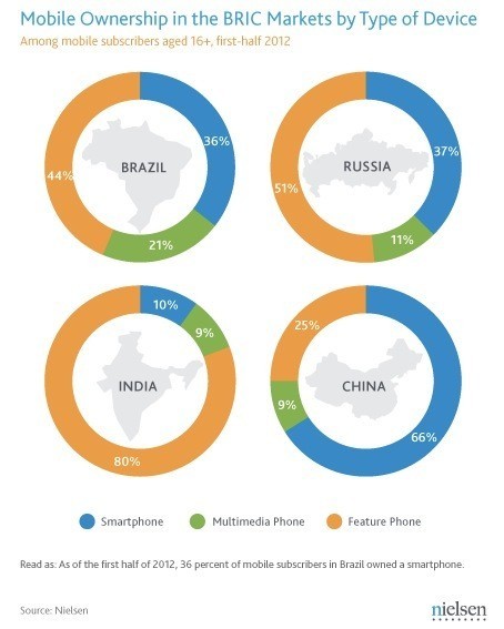 調(diào)研機構(gòu)尼爾森的研究發(fā)現(xiàn),截止2012上半年,中國智能手機用戶占比所有手機用戶的2/3,是在高速增長的金磚四國(巴西,俄羅斯,印度,中國)市場中唯一由智能手機用戶占據(jù)主導(dǎo)地位的國家。IDC預(yù)測,到2016年,中國智能機普及率將達到驚人的72%,大部分手機用戶使用的都將是智能機。2013年10月美國智能手機用戶數(shù)約1.492億,滲透率為62.5%。