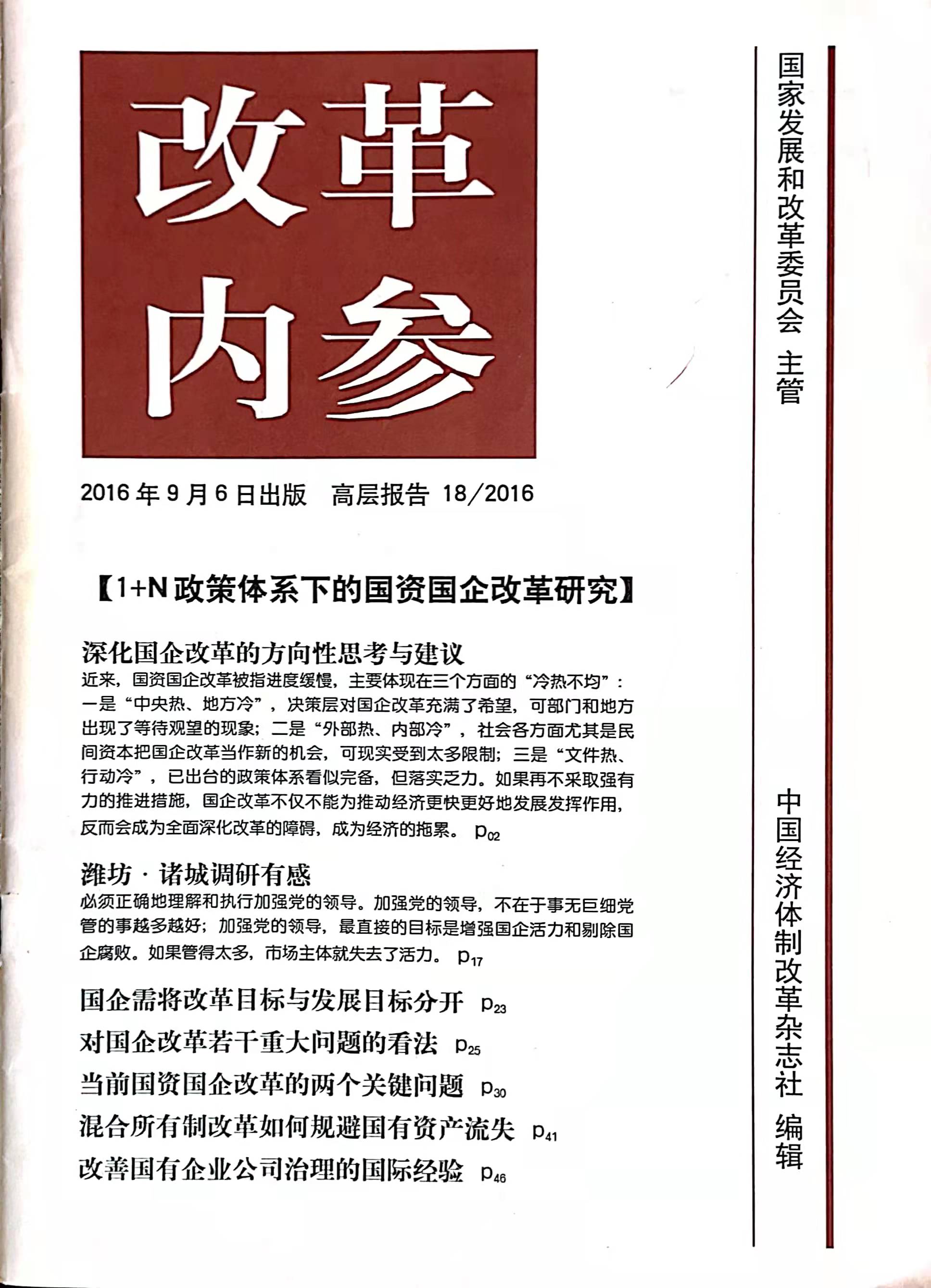 研究報(bào)告全文1.4萬(wàn)字,作為主報(bào)告,發(fā)表于2016年9月6日出版的《改革內(nèi)參》高層報(bào)告。