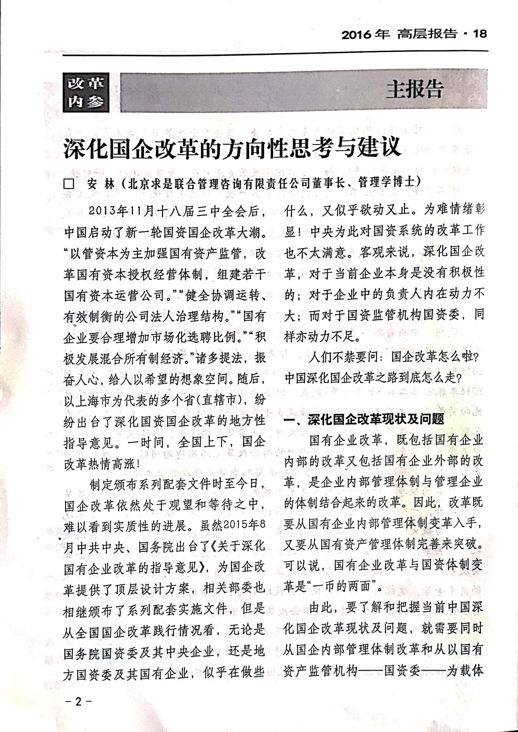 2016年8月,求是咨詢(xún)董事長(zhǎng)、《改革內(nèi)參》高層報(bào)告特約研究員安林博士,為《改革內(nèi)參》高層報(bào)告撰寫(xiě)特約報(bào)告《深化國(guó)企改革的方向性思考與建議》。