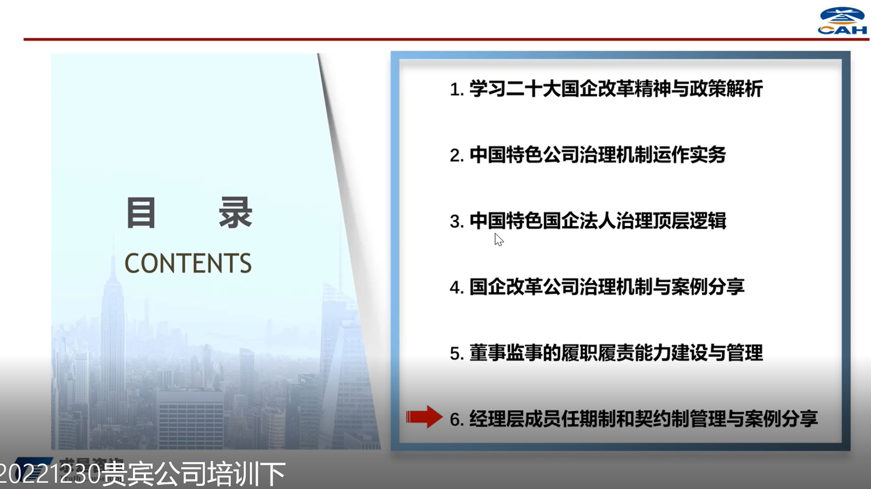 陳慶博士應(yīng)貴賓公司需求,定向開發(fā)了此次講座,內(nèi)容包括:學(xué)習(xí)二十大國(guó)企改革精神與政策解析、中國(guó)特色公司治理機(jī)制運(yùn)作實(shí)務(wù)、中國(guó)特色國(guó)企法人治理頂層邏輯、國(guó)企改革公司治理機(jī)制與案例分享、董事監(jiān)事的履職履責(zé)能力建設(shè)與管理和經(jīng)理層成員任期制與契約化管理與案例分享等六個(gè)方面。講座內(nèi)容博大精深、干貨滿滿,獲得貴賓公司領(lǐng)導(dǎo)及參訓(xùn)人員的高度認(rèn)可和評(píng)價(jià)。