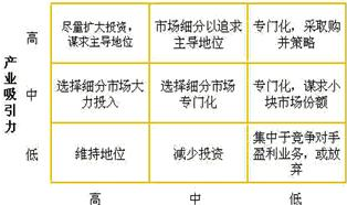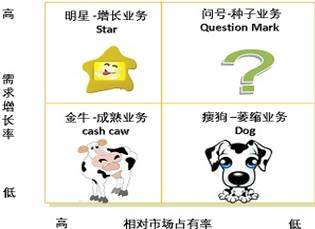 業(yè)務(wù)組合的傳統(tǒng)設(shè)計(jì)所依據(jù)的經(jīng)典理論,最為人們所熟悉的首先當(dāng)屬波士頓矩陣。波士頓矩陣以縱軸的市場(chǎng)吸引力和橫軸的業(yè)務(wù)競(jìng)爭(zhēng)能力來(lái)劃分出四個(gè)象限,用以得出企業(yè)所擁有的業(yè)務(wù)取舍的決策。其中,市場(chǎng)引力選用的指標(biāo)是市場(chǎng)需求的增長(zhǎng)速度,而業(yè)務(wù)競(jìng)爭(zhēng)力的衡量指標(biāo)是該業(yè)務(wù)所占有的市場(chǎng)份額大小。