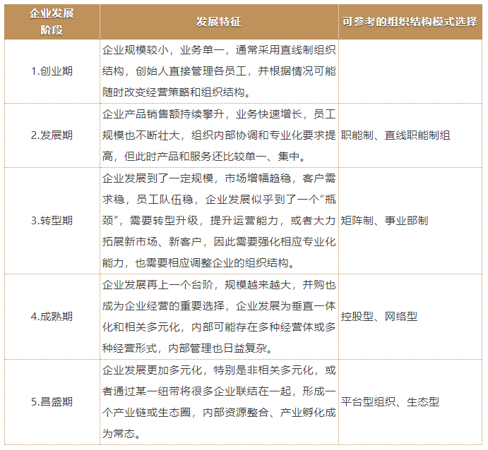 實踐中,大部分企業(yè)以企業(yè)所處生命周期為主要選擇因素,同時在綜合考慮企業(yè)所處環(huán)境、企業(yè)戰(zhàn)略及企業(yè)規(guī)模以企業(yè)所處生命周期特征,對所選擇的組織結構模式做適度調整確定企業(yè)組織結構模式。