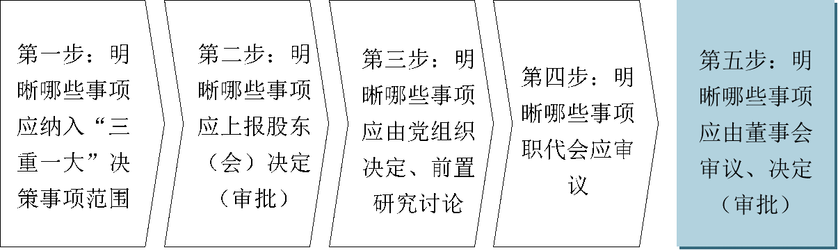 “三重一大”決策事項,是股東會、董事會、黨組織等公司治理主體決策的核心事項。筆者所在求是咨詢團隊,基于常年國企治理管控咨詢實踐認為,國有企業(yè)健全法人治理結構的權責關鍵就在于:要科學合理地制定涵蓋各治理主體的“三重一大”的決策事項清單及流程。為此,我們構建了如下國企制定“三重一大”決策事項清單“五步法”路線圖。