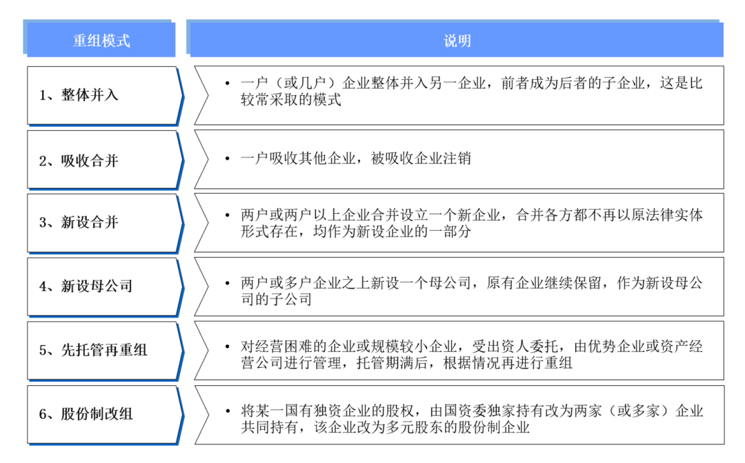 以中央企業(yè)為例,重組主要有六種模式:整體并入、吸收合并、新設(shè)合并、新設(shè)母公司、先托管再重組、股份制改組,具體如下。