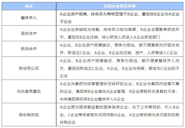 不同類型企業(yè)重組適用不同重組模式,以上六類主要重組模式具體適用情況如下。