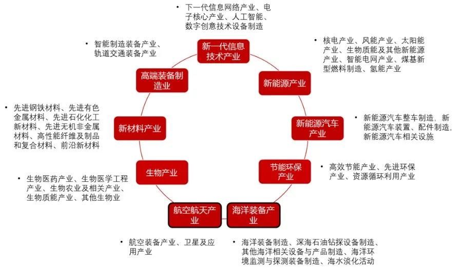 重點(diǎn)發(fā)展方向:節(jié)能環(huán)保產(chǎn)業(yè)(高效節(jié)能產(chǎn)業(yè)、先進(jìn)環(huán)保產(chǎn)業(yè)、資源循環(huán)利用產(chǎn)業(yè))、新一代信息技術(shù)產(chǎn)業(yè)(下一代信息網(wǎng)絡(luò)產(chǎn)業(yè)、電子核心基礎(chǔ)產(chǎn)業(yè)、高端軟件和新興信息服務(wù)產(chǎn)業(yè))、生物產(chǎn)業(yè)(生物醫(yī)藥產(chǎn)業(yè)、生物醫(yī)學(xué)工程產(chǎn)業(yè)、生物農(nóng)業(yè)產(chǎn)業(yè)、生物制造產(chǎn)業(yè))、高端裝備制造產(chǎn)業(yè)(航空裝備產(chǎn)業(yè)、衛(wèi)星及應(yīng)用產(chǎn)業(yè)、軌道交通裝備產(chǎn)業(yè)、智能制造裝備產(chǎn)業(yè))、新能源產(chǎn)業(yè)(核電技術(shù)產(chǎn)業(yè)、風(fēng)能產(chǎn)業(yè)、太陽(yáng)能產(chǎn)業(yè)、生物質(zhì)能產(chǎn)業(yè))、新材料產(chǎn)業(yè)(新型功能材料產(chǎn)業(yè)、先進(jìn)結(jié)構(gòu)材料產(chǎn)業(yè)、高性能復(fù)合材料產(chǎn)業(yè))、新能源汽車產(chǎn)業(yè)。