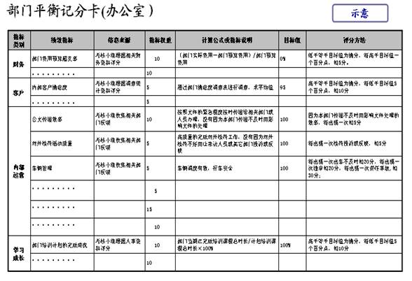 我們可參考上述幾個關(guān)鍵點(diǎn)來編制部門平衡計分卡。員工層面的平衡計分卡設(shè)立則是結(jié)合部門平衡計分卡和員工崗位職責(zé)來進(jìn)行。